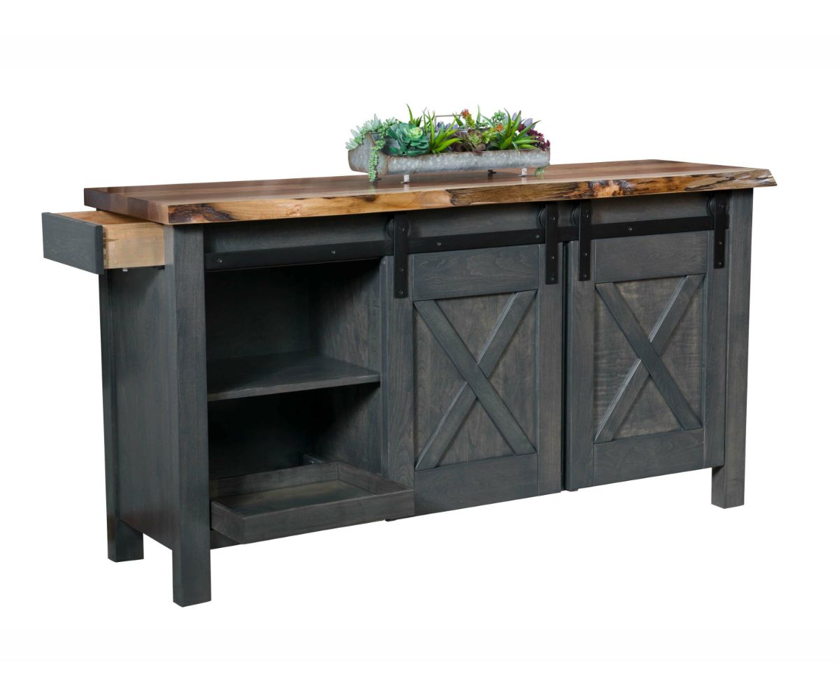 Features: • Drawers on each end just under the top • Sliding doors with barn tracks • One adjustable shelf in each section • Pullout shelf on the bottom behind each door